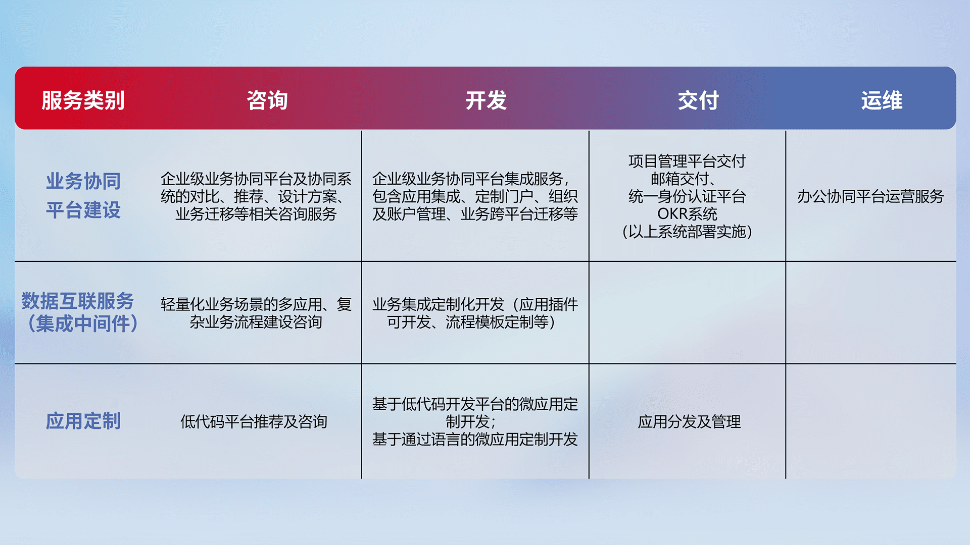 针对钉钉、、、企微、、、、IDaas等平台级产品提供产品的规划、、、方案、、交付、、定制化开发等服务,,实现如统一协同办公、、、、智能客户服务、、、混合会议管理、、、、智能数据查询、、、等业务场景,,,,实现数字化转型。。。。